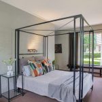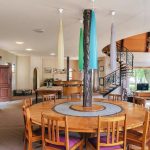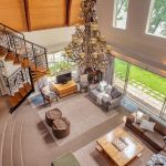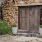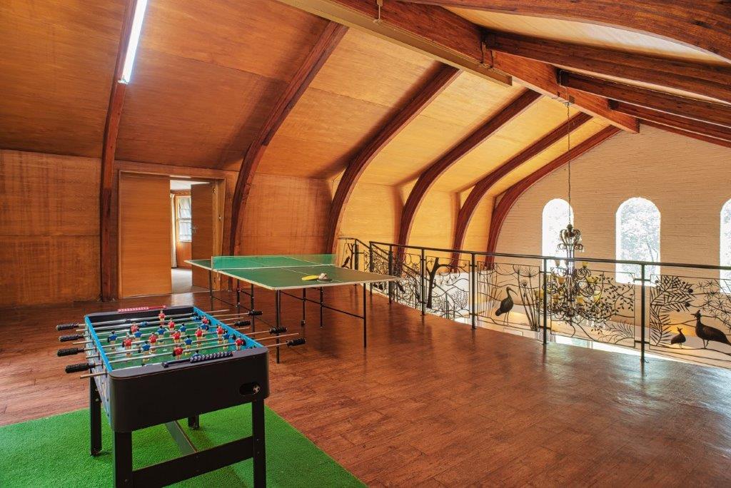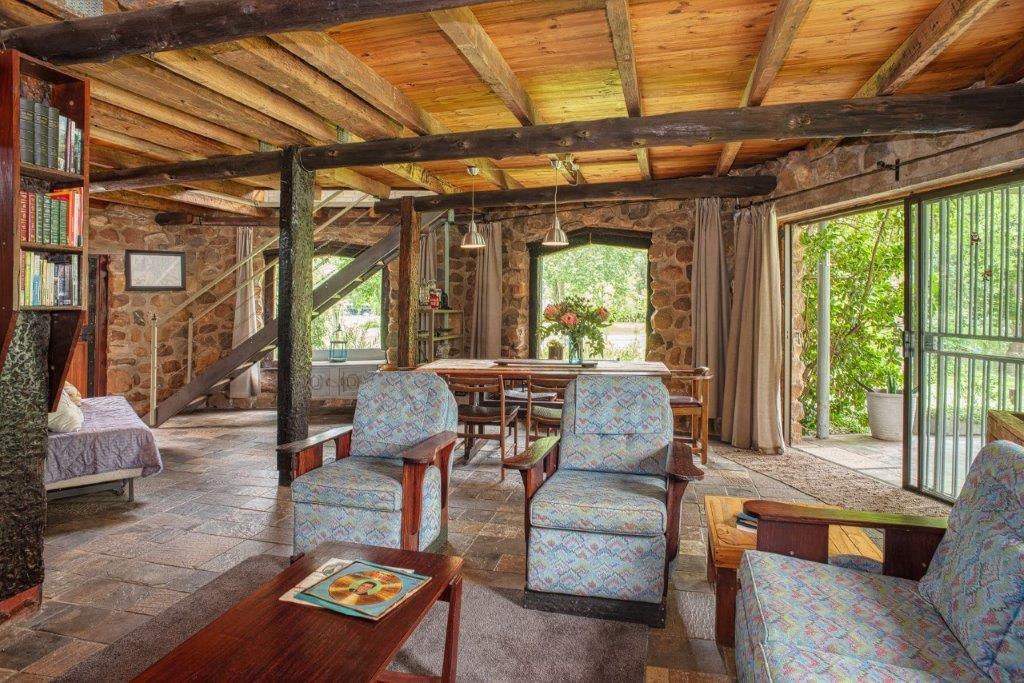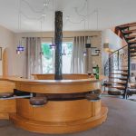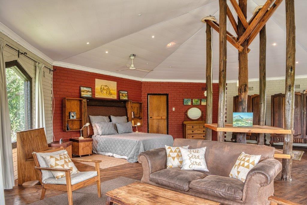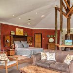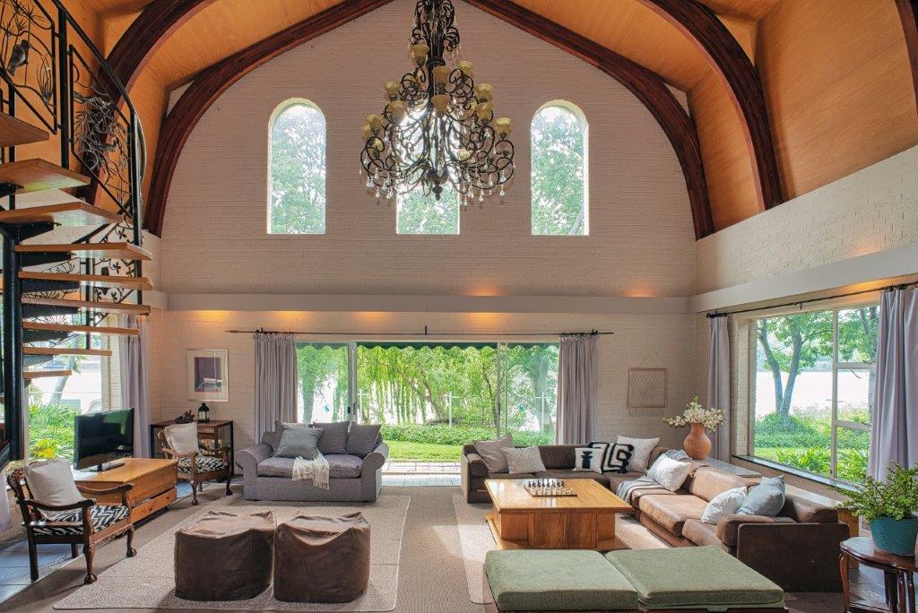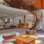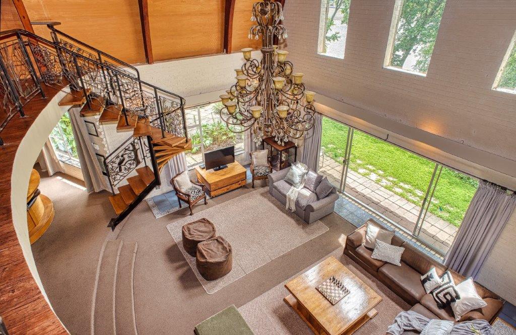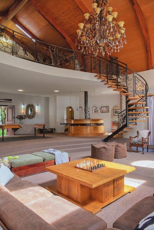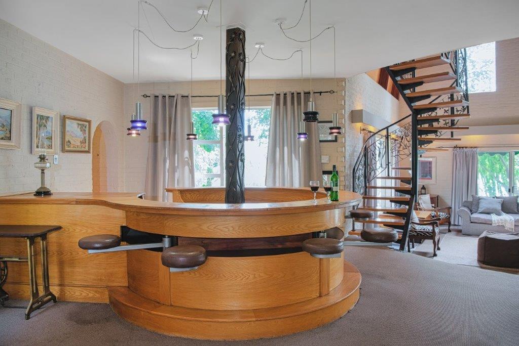 The main living area is a double-volume delight with emphasis on the natural materials of wood and steel. Light floods in through large windows facing the river bank, showcasing this magnificent space as an oasis of relaxation, entertainment, togetherness and celebration. You can’t help but notice the semi-spiral staircase that winds up to the generously portioned landing. The beautiful banister incorporates artistically rendered local birdlife in its design, bringing the outdoors indoors. Wooden roof buttresses draw your eye upwards, while a large chandelier and the vertical supports that double as centrepieces balance the picture in the open-plan bar and dining room.