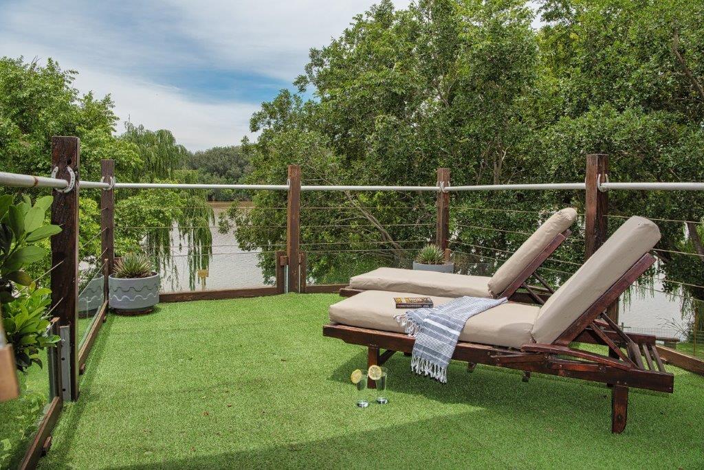 The open-plan ground floor is neatly divided into living room, dining room and kitchen. Throw open the sliding doors for an additional outdoor dining experience. Head upstairs to an ample open-plan bedroom with comfy living area as well as an outdoor viewing deck. Sundowners overlooking the Vaal River or lazy afternoon reading on a lounger – how perfect!